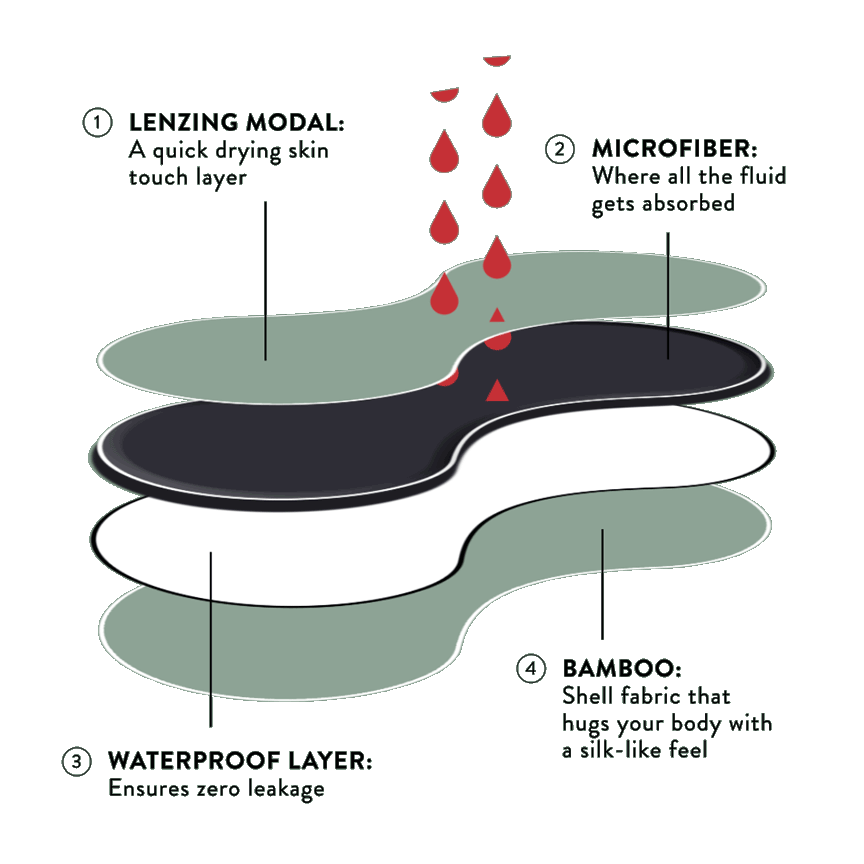 Our padded panties consist of four absorbent layers engineered to effectively absorb your flow. For more details, check out our how it works page.